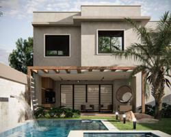 Arquitetura contemporânea em dois pavimentos, com ampla área social integrada (sala, jantar, cozinha e churrasqueira). Conta com 3 suítes (sendo 1 master com claraboia), lavabo, lavanderia e escada plissada. Piscina com deck, aquecimento solar, paisagismo e garagem para 4 veículos. Residência em condomínio fechado, com espera para aquecimento solar e carregadores de carros elétricos.